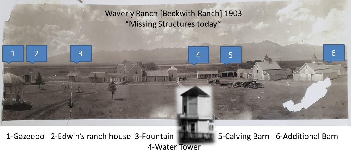 The Beckwith ranch circa 1907. Missing structures shown in picture includes: Water Tower, Gazeebo, fountain, Edwin’s Ranch House, and picket fence.