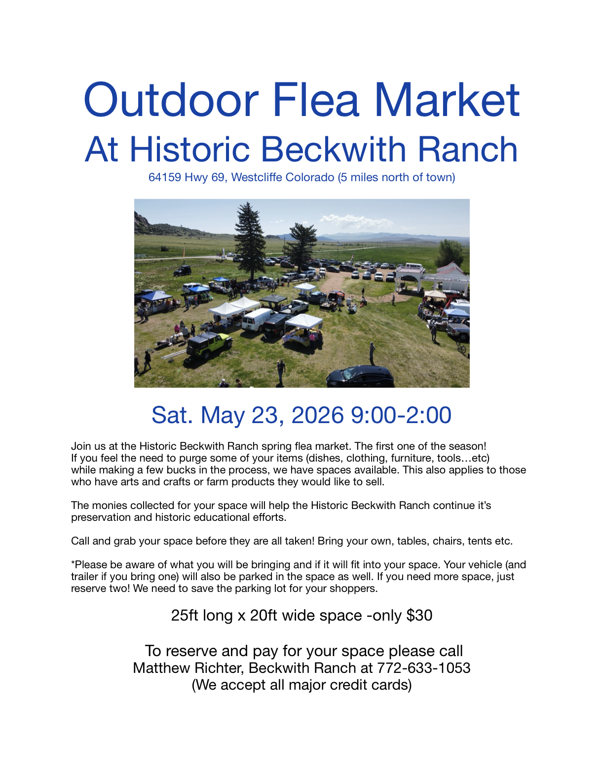 Join us as a Vendor or a Shopper at the Historic Beckwith Ranch flea market and book fair. If you feel the need to purge some of your items (dishes, clothing, furniture, tools, etc.) we have vendor spaces available. This also applies for those who have arts and crafts or farm products they would like to sell. Shoppers come for the market, grounds and tours of the mansion and our gift shop will be open. We will also have a coffee and donuts for those who would like to picnic in the backyard. The monies collected for rental spaces and snacks help the Historic Beckwith Ranch continue its preservation and educational programs. For Information or Space Reservation Please – Email: friendsofbeckwithranch@gmail.com